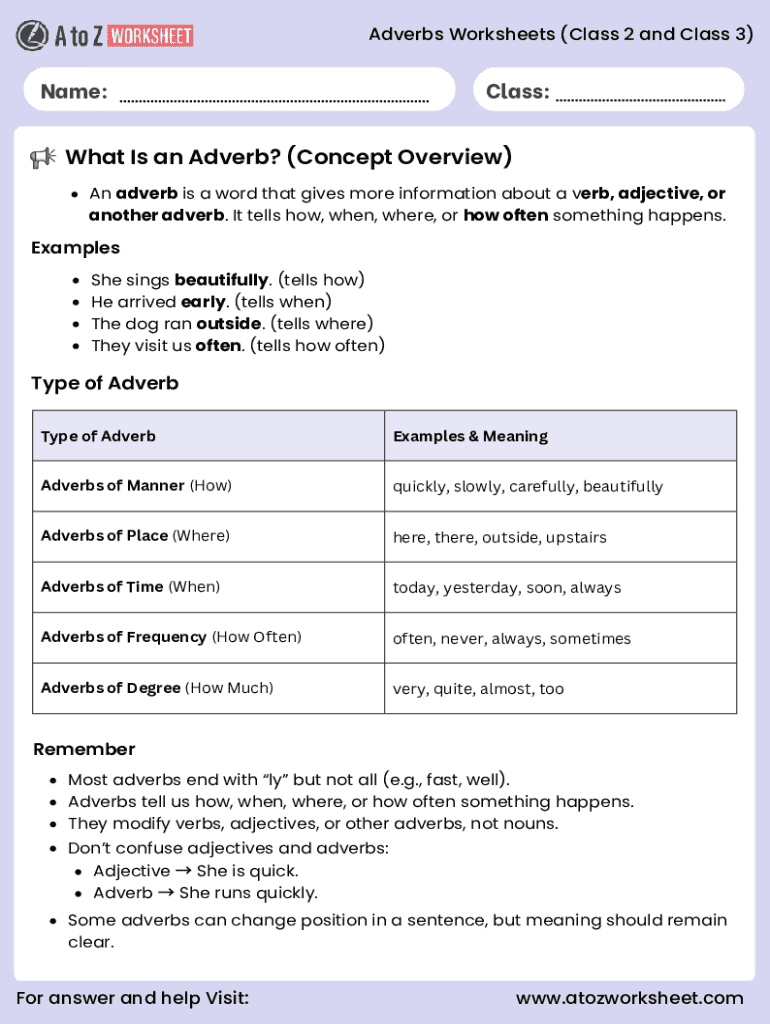 Get the free Adverbs Worksheets for Class 2 and 3