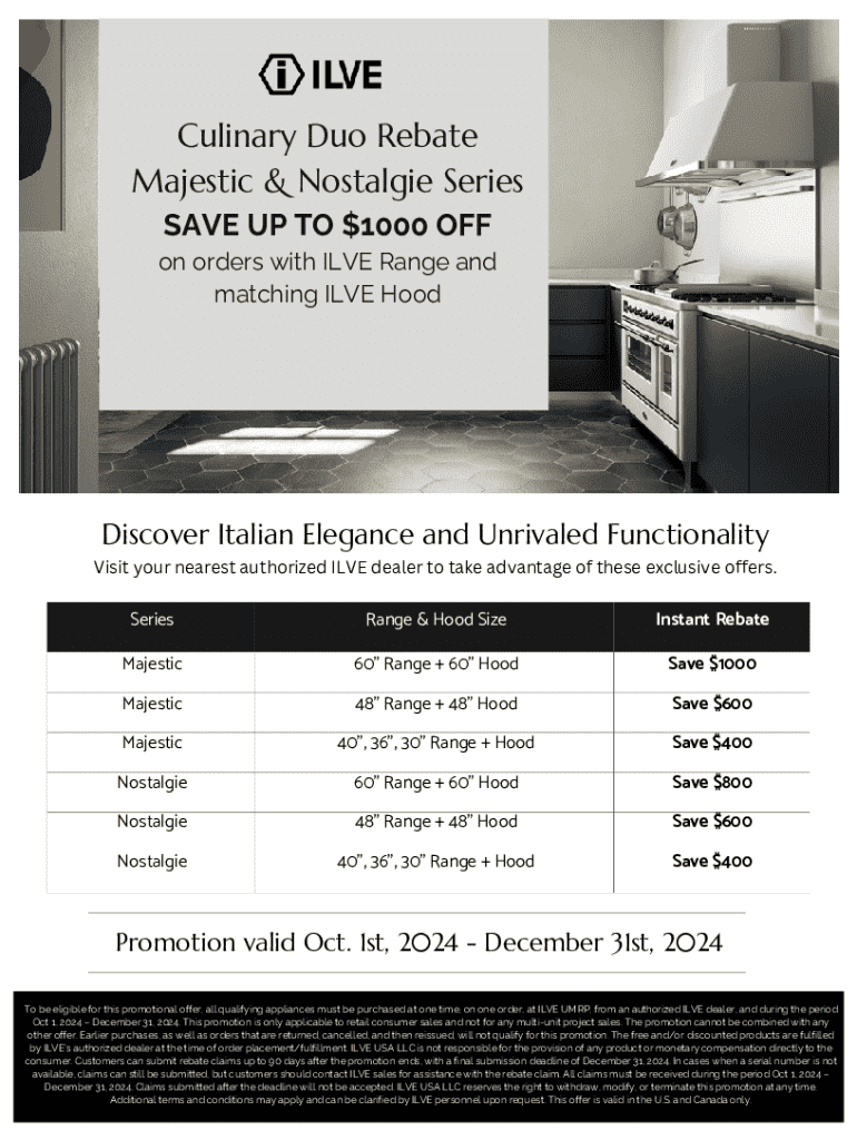 This rebate form is essential for anyone who has recently purchased eligible ILVE appliances. Customers looking to benefit from the ILVE Range and Hood Rebate must ensure they possess compliant products.