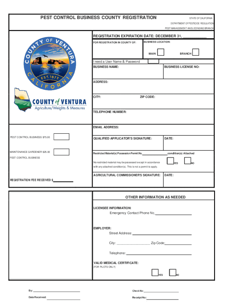 You will need your business name, business license number, address, city, zip code, telephone number, email address, and signatures from both a qualified applicator and an agricultural commissioner.