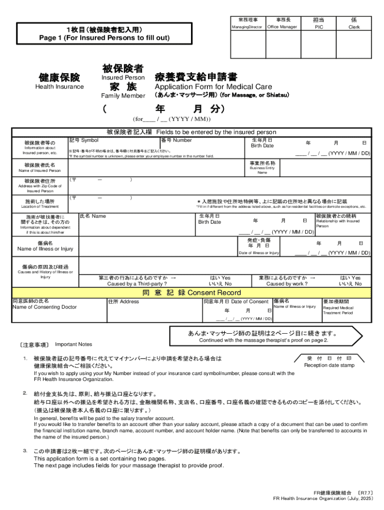 The Health Insurance Medical Care Application Form is an essential document in Japan that allows insured persons to apply for benefits related to massage or shiatsu treatments. This form plays a crucial role in the healthcare process by enabling insured individuals to claim medical care benefits efficiently. Both insured persons and massage therapists use this form, underlining its significance in facilitating access to necessary therapeutic services.
