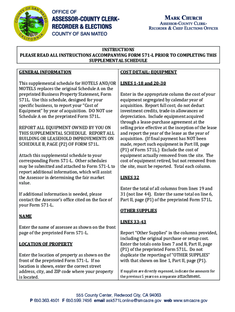 The Supplemental Schedule for Form 571-L must be completed by hotel and motel owners in California who report equipment costs for tax assessment purposes.