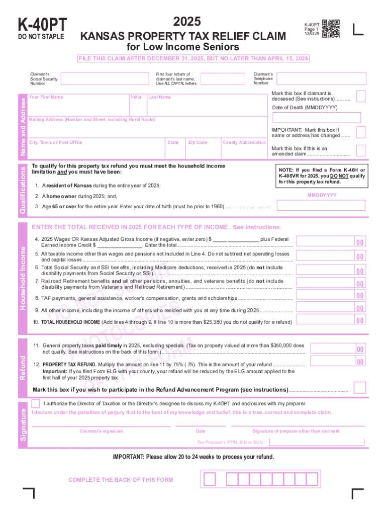 The Kansas K-40PT form is specifically designed to assist low-income seniors in claiming property tax relief. This form plays a crucial role in providing financial support, allowing seniors to alleviate some of their property tax burdens. By filing this claim, eligible individuals can benefit from a refund that is calculated at 75% of the property taxes they have paid, significantly impacting their financial situation.