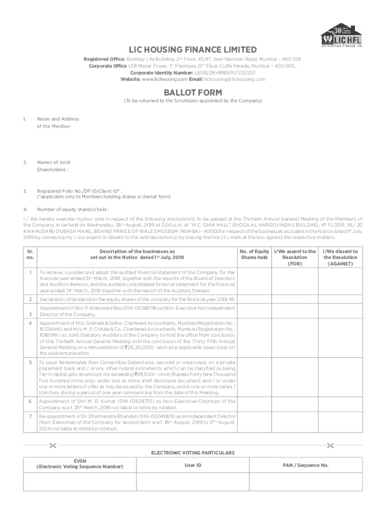 The LIC Housing Finance Ballot Form is intended for members of LIC Housing Finance who are eligible to vote at the company’s Thirtieth Annual General Meeting.
