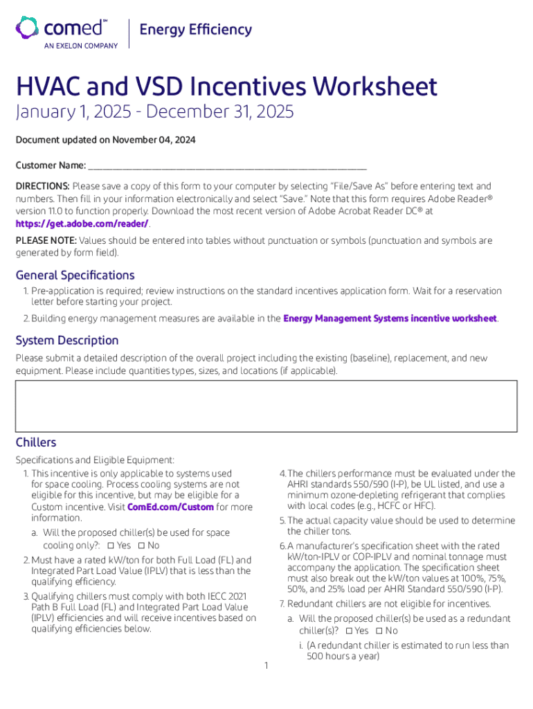 The HVAC and VSD Incentives Worksheet is a key document designed for customers to apply for financial incentives related to HVAC and Variable Speed Drive (VSD) projects. This form captures crucial project descriptions and equipment specifications to facilitate efficient processing of incentives. The worksheet is valid from January 1, 2025, to December 31, 2025, providing users ample time to submit applications for the various specific projects and incentives it covers.