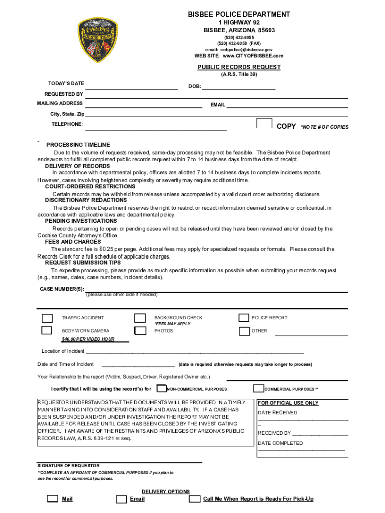 Processing times for public records requests can vary, but it is generally advisable to allow several business days for the Bisbee Police Department to review and fulfill your request.