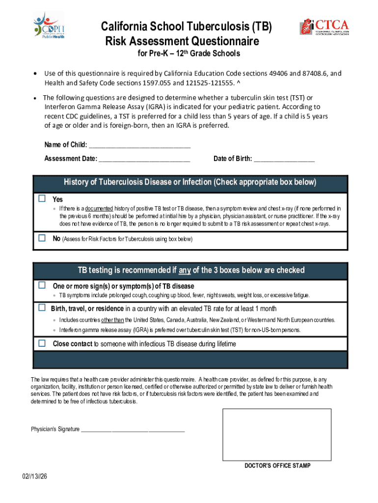 The California School Tuberculosis Risk Assessment Questionnaire is a medical consent form used by healthcare providers to determine the need for tuberculosis testing in pediatric patients attending school.