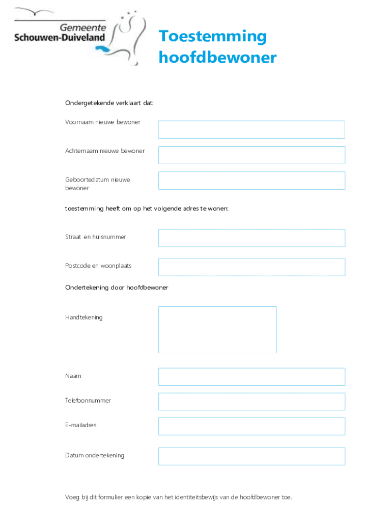 Hoofdbewoners die toestemming geven voor een nieuwe huurder op hun adres moeten dit formulier invullen. Ook verhuurders en vastgoedbeheerders kunnen dit formulier nodig hebben.