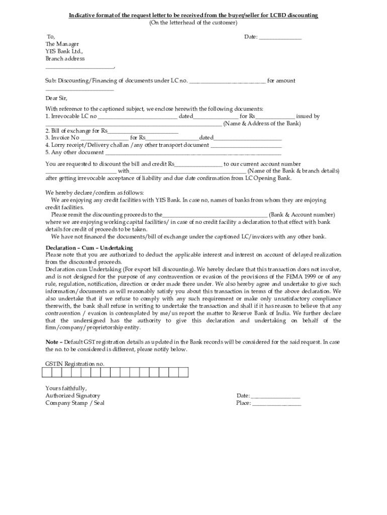 The Request Letter for LCBD Discounting is a business form used by buyers or sellers to request the discounting of documents under a Letter of Credit (LC) from YES Bank.