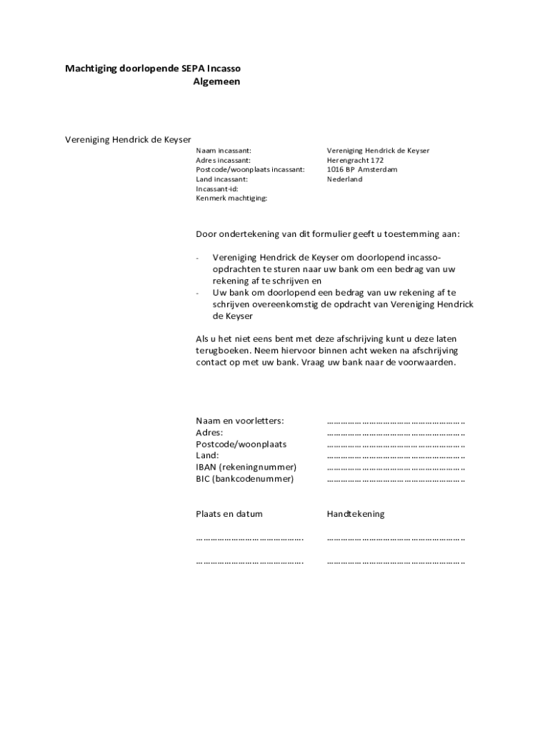 Het SEPA Direct Debit Authorization Form is vereist voor verschillende doelgroepen, vooral voor leden van organisaties zoals Vereniging Hendrick de Keyser die gebruik maken van automatische incasso's. Dit formulier is noodzakelijk in situaties waarin regelmatig betalingen moeten worden gedaan, zoals lidmaatschapsbijdragen of verzekeringspremies. Dit zorgt ervoor dat de leden hun verplichtingen gemakkelijk kunnen nakomen.