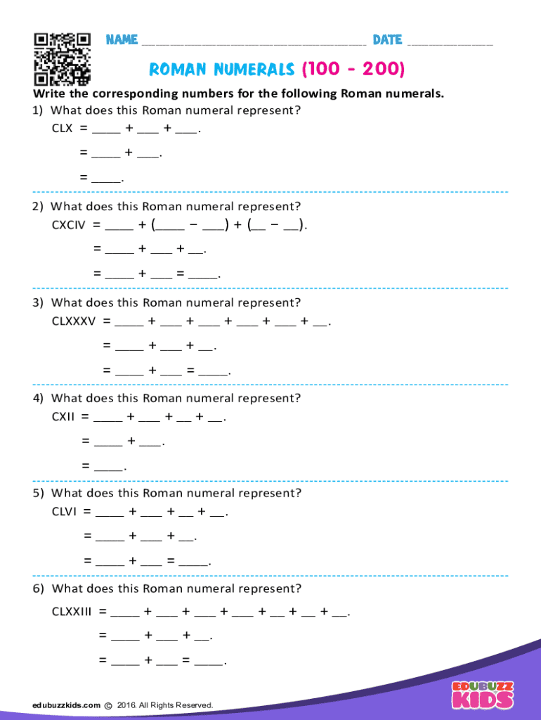 The Roman Numerals Worksheet is an educational tool designed for teaching students how to convert Roman numerals effectively. Its main aim is to enhance students' understanding of these numerical systems, which is crucial for their academic development. Mastering Roman numeral conversions is essential for students, as it builds a foundation for more complex mathematical concepts. The worksheet includes exercises focusing on converting numbers that range between 100 and 200.