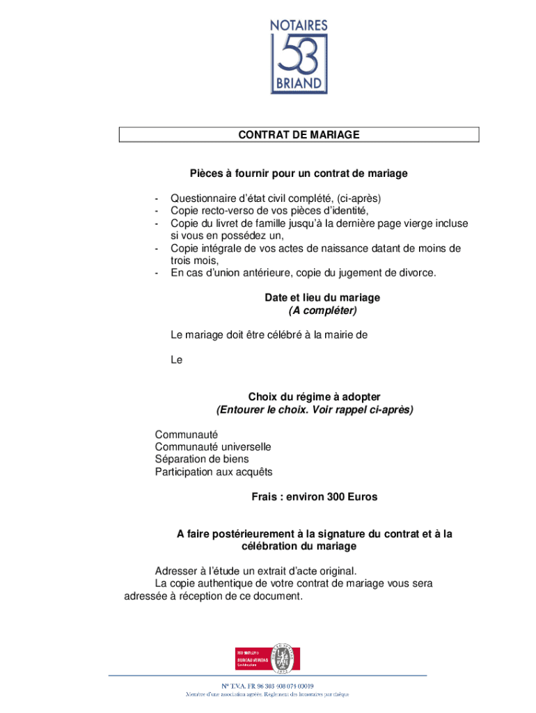 Several essential elements are included in the French Marriage Contract, which couples must complete accurately. Required personal information includes:
