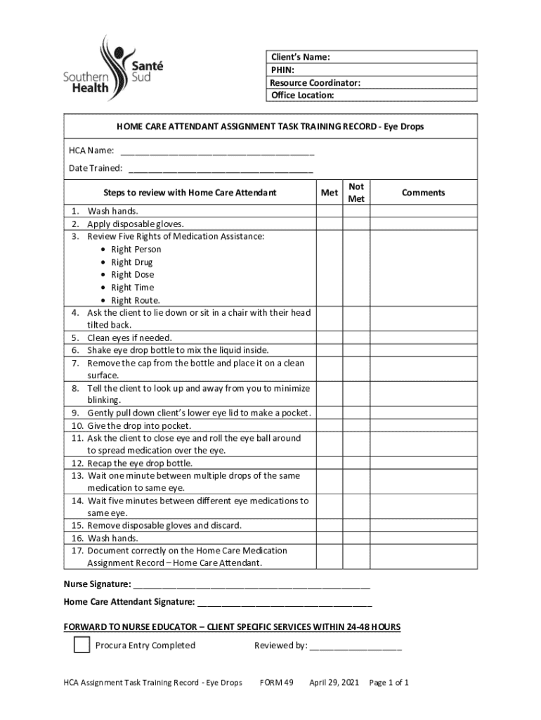 Key Features of the Home Care Attendant Assignment Task Training Record for Eye Drops