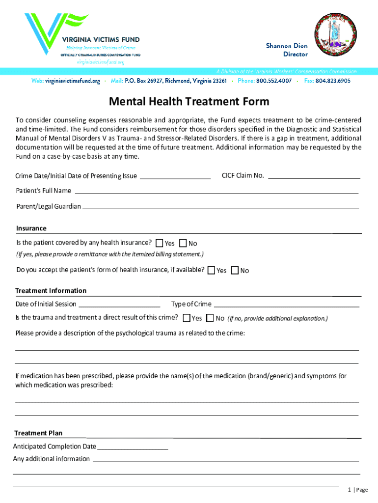 The Mental Health Treatment Form is a medical consent form used by healthcare providers to authorize and document mental health treatment related to crime-centered trauma in Virginia.
