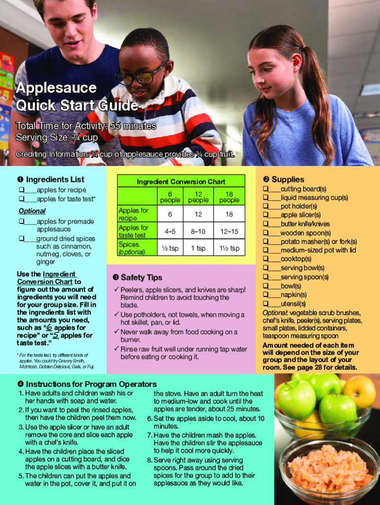 The Team Nutrition Cooks Applesauce Recipe Guide is an essential resource designed for educators and facilitators aiming to teach children aged 8 to 12 how to create applesauce. This guide is intended for use in group settings, making it ideal for classrooms, after-school programs, and camps. The educational objectives focus on developing cooking skills and promoting healthy eating habits among young learners.