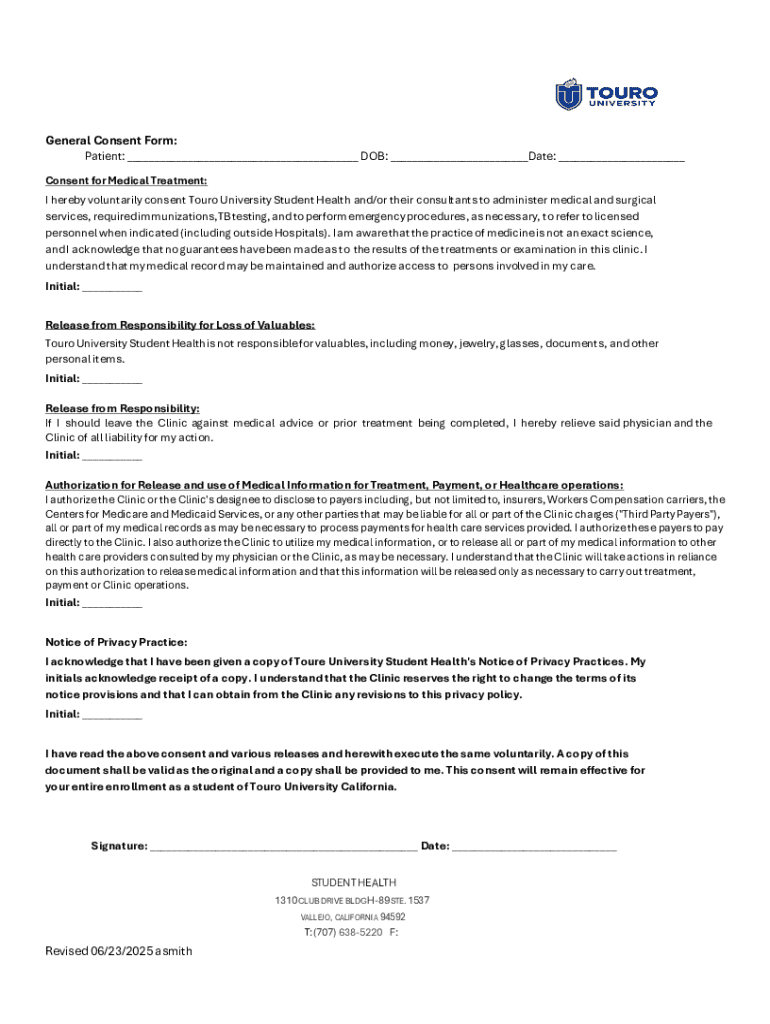 The Touro University General Consent Form is a medical consent document used by students to authorize medical treatment and release medical information.