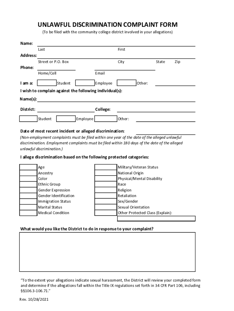 Any individual who believes they have experienced unlawful discrimination within a community college district is eligible to file this form. This includes students, staff, and visitors.