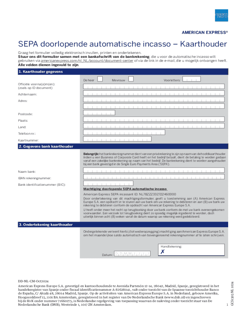 Dit formulier is bedoeld voor kaarthouders die zich bevinden in de SEPA-zone. Iedereen die gebruik maakt van de diensten van American Express en automatische incasso wil instellen, dient dit formulier in te vullen en in te dienen.