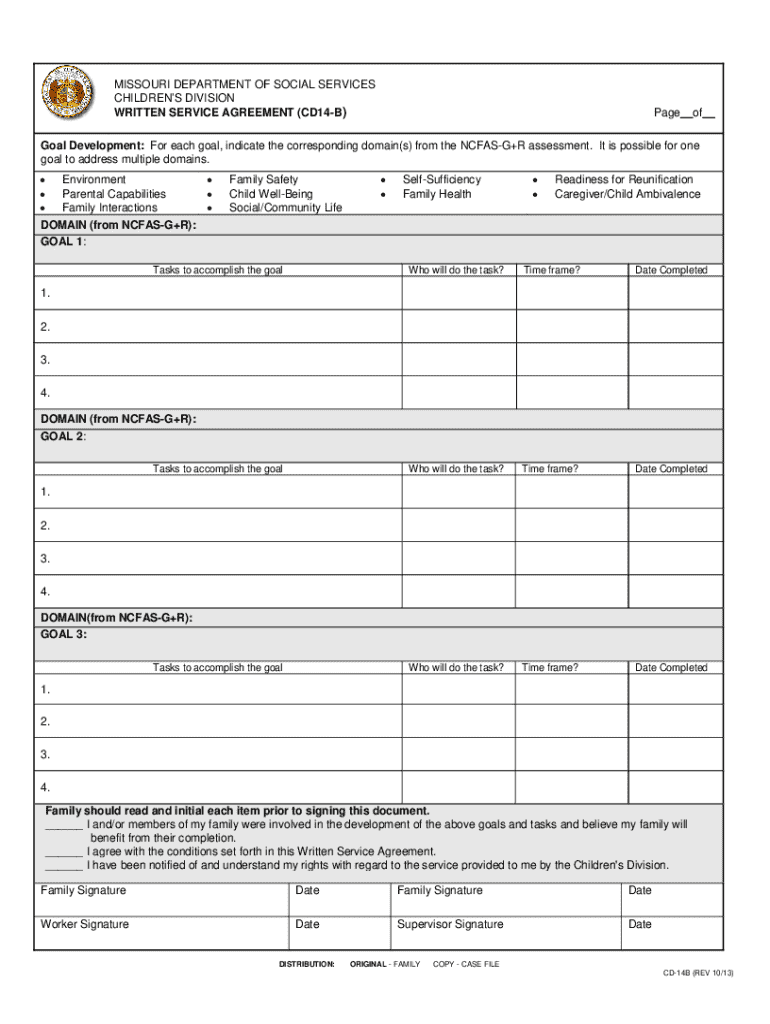 The Missouri Written Service Agreement CD14-B is a government form used by the Missouri Department of Social Services to outline goals and tasks for families involved with the Children's Division.