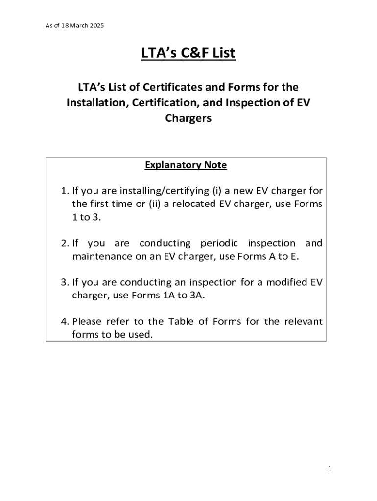 The EV Charger Certification Forms are essential documents utilized for the installation, inspection, and maintenance of electric vehicle chargers in Singapore. These forms serve multiple purposes, including ensuring that the installations comply with local safety and operational standards.