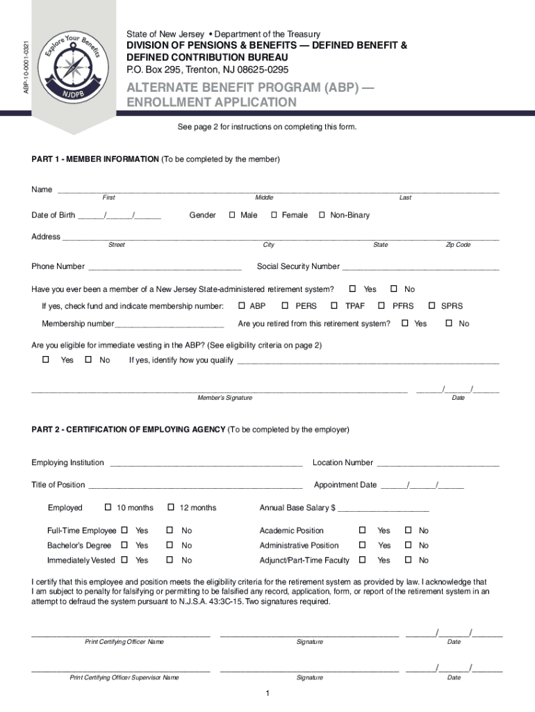 The New Jersey ABP Enrollment Application is an employment form used by employees and employers to enroll in the Alternate Benefit Program (ABP) for pension benefits.