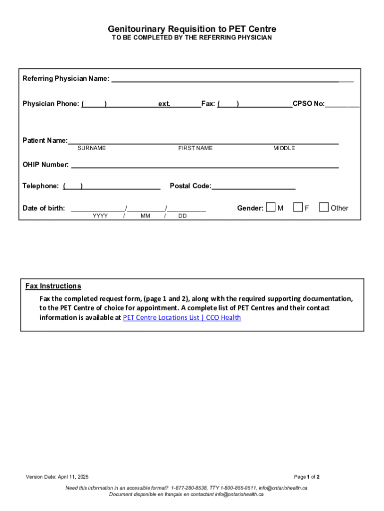 The Genitourinary Requisition to PET Centre is a medical form used by referring physicians in Ontario to request PET scans for patients with bladder cancer or germ cell tumors.