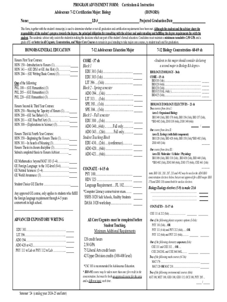 The Program Advisement Form serves as a critical tool for students, specifically those pursuing a Biology (HONORS) major and Adolescence Education certification. Its primary purpose is to ensure that students are aware of and verify their graduation and certification requirements. By utilizing this form, students can clearly outline the necessary steps and courses required for successful completion of their academic goals.