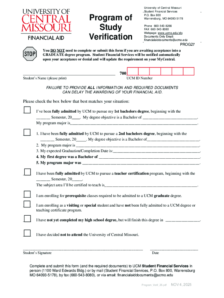 The University of Central Missouri Financial Aid Verification Form is a crucial document that aids students in verifying their admission status and degree objectives for financial aid purposes. This form's primary intent is to confirm essential details such as admission status and expected graduation date.