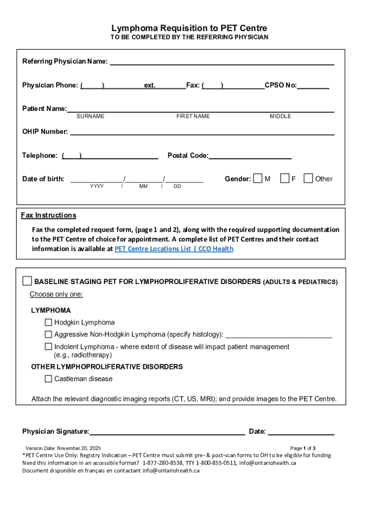 The Lymphoma Requisition to PET Centre is a medical form used by referring physicians in Ontario, Canada, to request PET scans for patients with lymphoproliferative disorders.