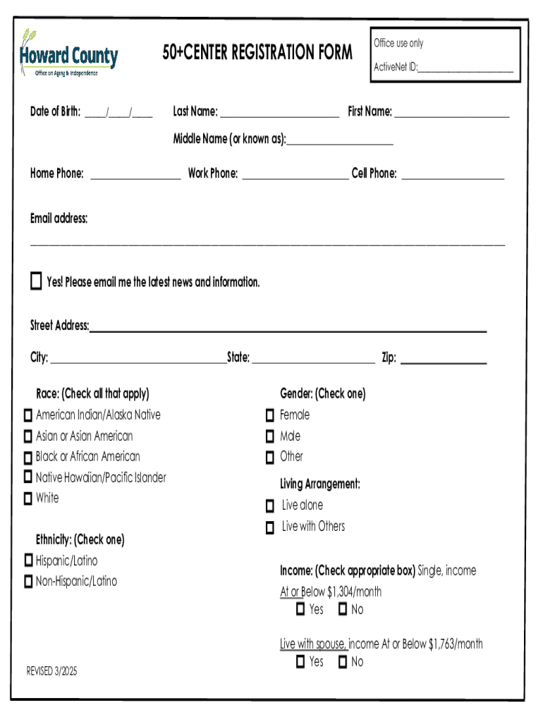 The Howard County 50+ registration form includes specific fields essential for processing applications, such as: