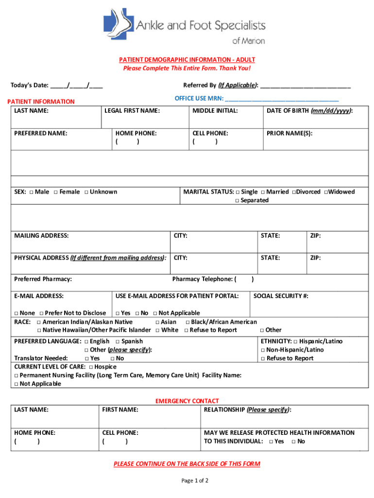 The Patient Demographic Information Form is required to be completed by adult patients seeking medical services as well as legal guardians who are filling out the form for minors.