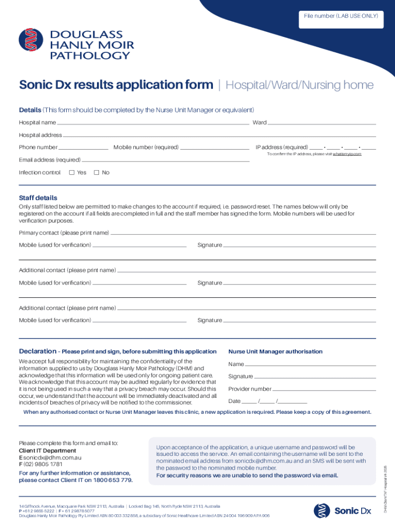 Specific roles within healthcare facilities require the completion of the Sonic Dx Results Application Form, particularly the Nurse Unit Manager and Primary Contact personnel. These individuals are responsible for authorizing access to patient information and managing the application process. The form also includes provisions for additional contact authorization, allowing other designated staff members to be included based on the hospital's needs.