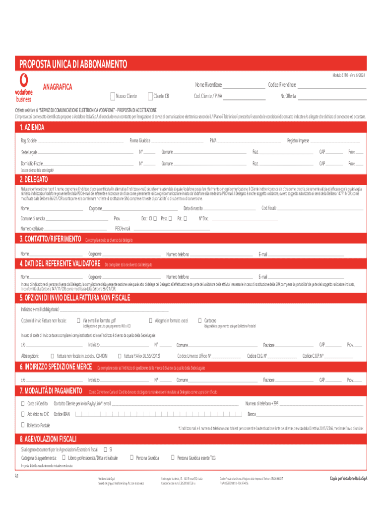 Il Vodafone Italy Subscription Offer Form è un documento utilizzato da aziende per proporre e accettare servizi di comunicazione elettronica di Vodafone.