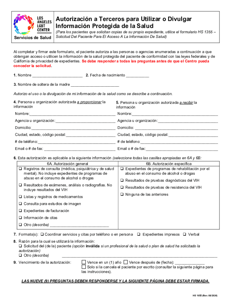 El formulario HS 1055 es un documento clave utilizado en California que permite a los pacientes autorizar el uso o la divulgación de su información de salud protegida. Su función principal es asegurar que cualquier transferencia de datos de salud ocurra con el consentimiento informado del paciente. La autorización de información de salud es crucial en el manejo de registros médicos, ya que garantiza que solo las partes autorizadas puedan acceder a información sensible.