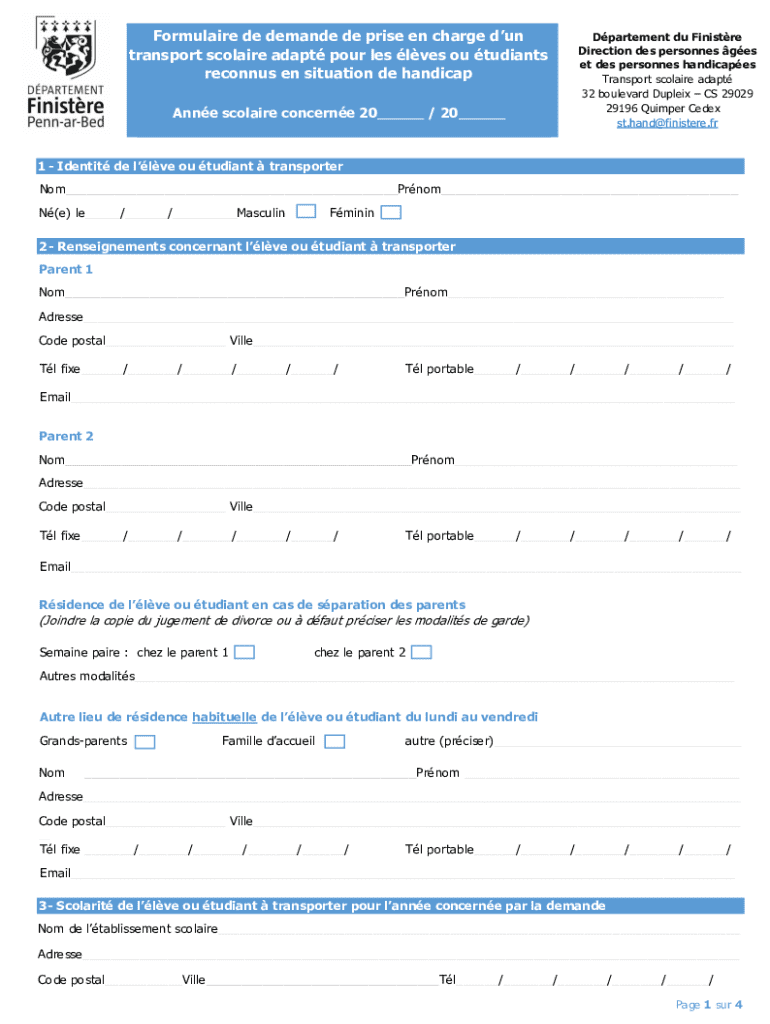 Le formulaire est destiné aux parents ou tuteurs d'élèves reconnus en situation de handicap dans le département du Finistère qui ont besoin d'un transport scolaire adapté.