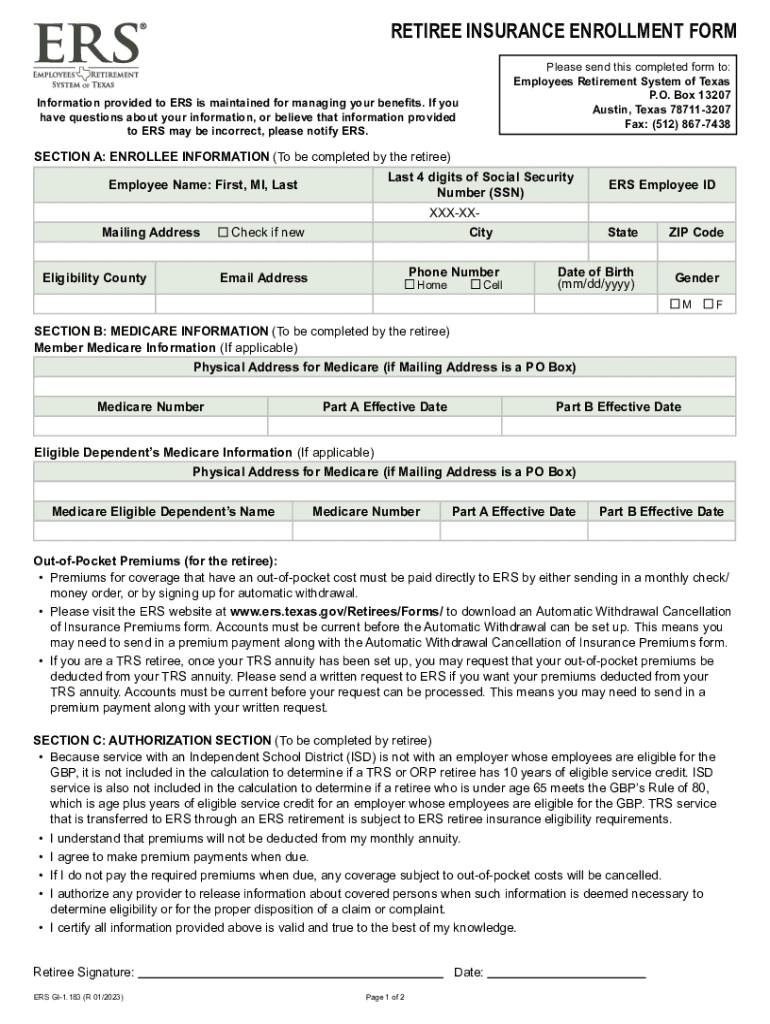 The Retiree Insurance Enrollment Form is a benefits enrollment document used by retirees in Texas to enroll in insurance benefits through the Employees Retirement System of Texas (ERS).