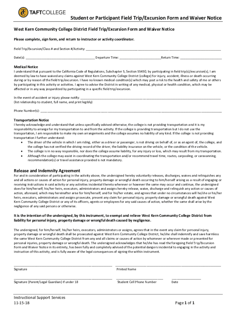 Get the free Field Trip Excursion Form and Waiver Notice