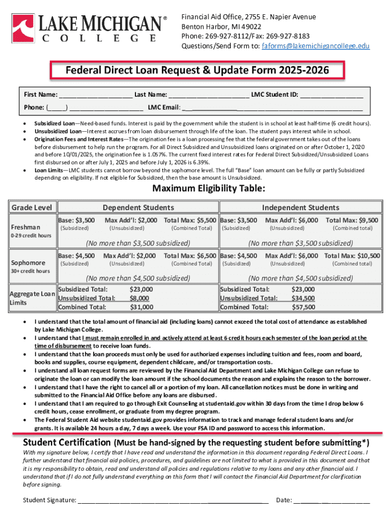 The deadline for submitting the Federal Direct Loan Request & Update Form for the 2025-2026 academic year typically aligns with the financial aid application deadlines set by Lake Michigan College. Check the college's financial aid office for specific dates.