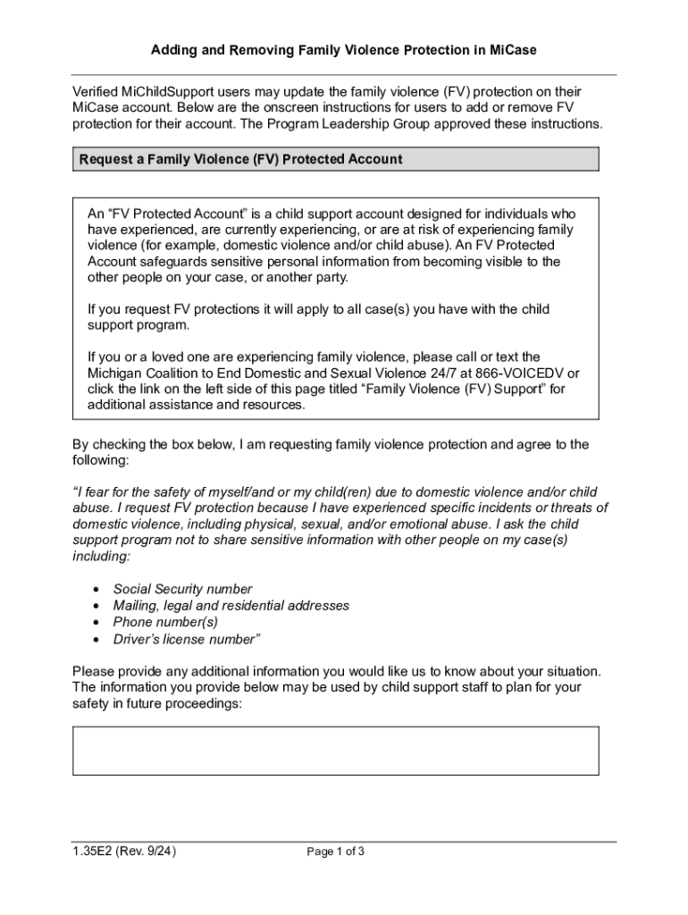 The Family Violence Protection Request Form is a legal document used by individuals to add or remove family violence protection on their MiCase account in Michigan. It serves to safeguard sensitive personal information in cases of family violence.