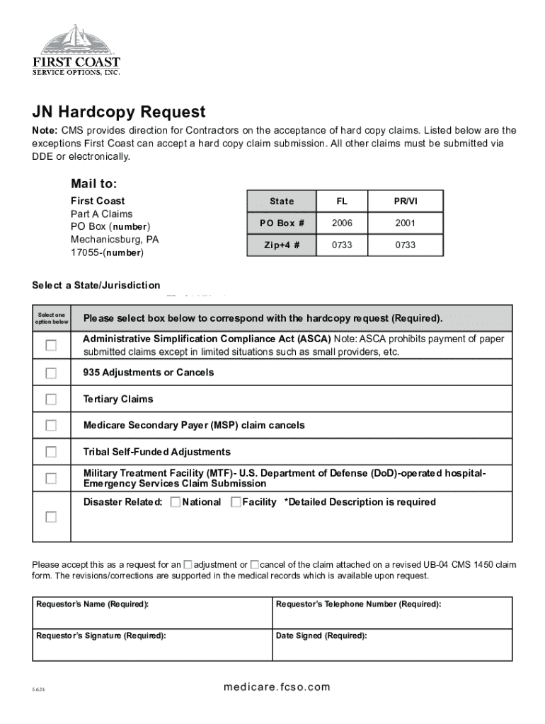 The First Coast Hardcopy Request Form is a document used to request adjustments or cancellations for Medicare claims submitted via the UB-04 CMS 1450 claim form. This form is specifically designed for circumstances such as ASCA compliance and disaster-related claims, where hardcopy submissions are accepted. It enables healthcare providers to manage errors effectively, ensuring compliance with Medicare regulations.