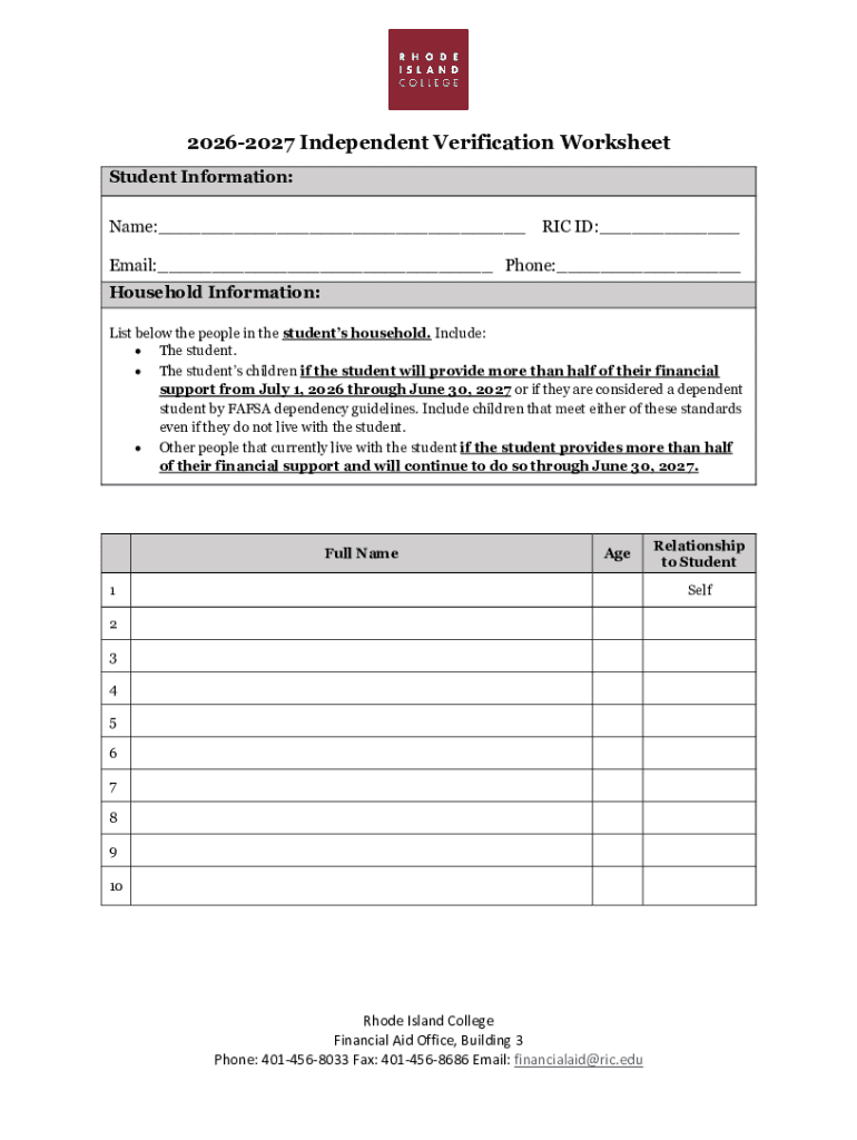 The 2026-2027 Independent Verification Worksheet is a financial aid application document used by students at Rhode Island College to verify household and income information for financial aid purposes.