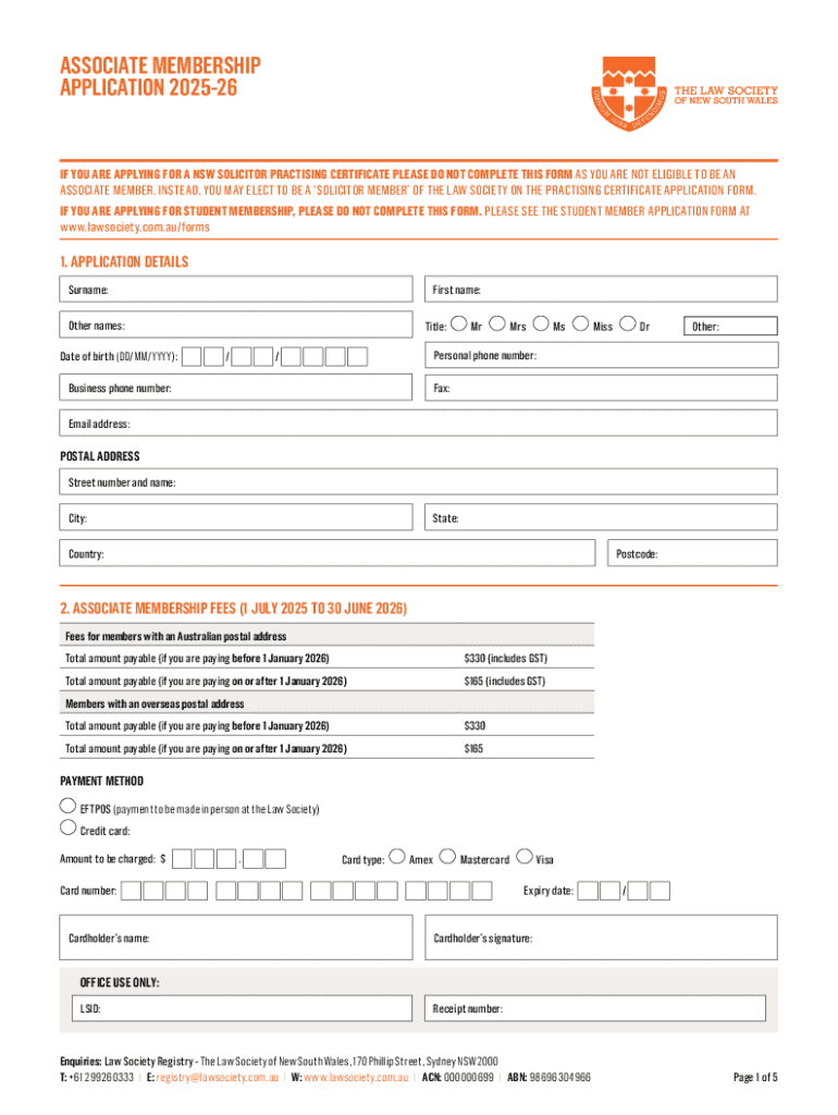 The Associate Membership Application for 2025-26 serves as an official form utilized by individuals aiming to become associate members of The Law Society of New South Wales. This application is intended primarily for law professionals and office managers, allowing them to gain access to various resources and support. The application remains valid throughout the 2025-26 membership period and must include personal details along with a selection of the desired membership category.