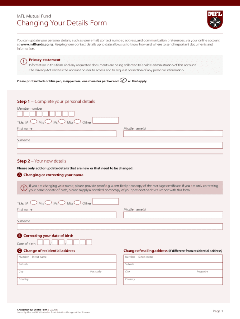 The MFL Mutual Fund Changing Your Details Form is a personal document used by members to update their personal information with Mercer (N.Z.) Limited.