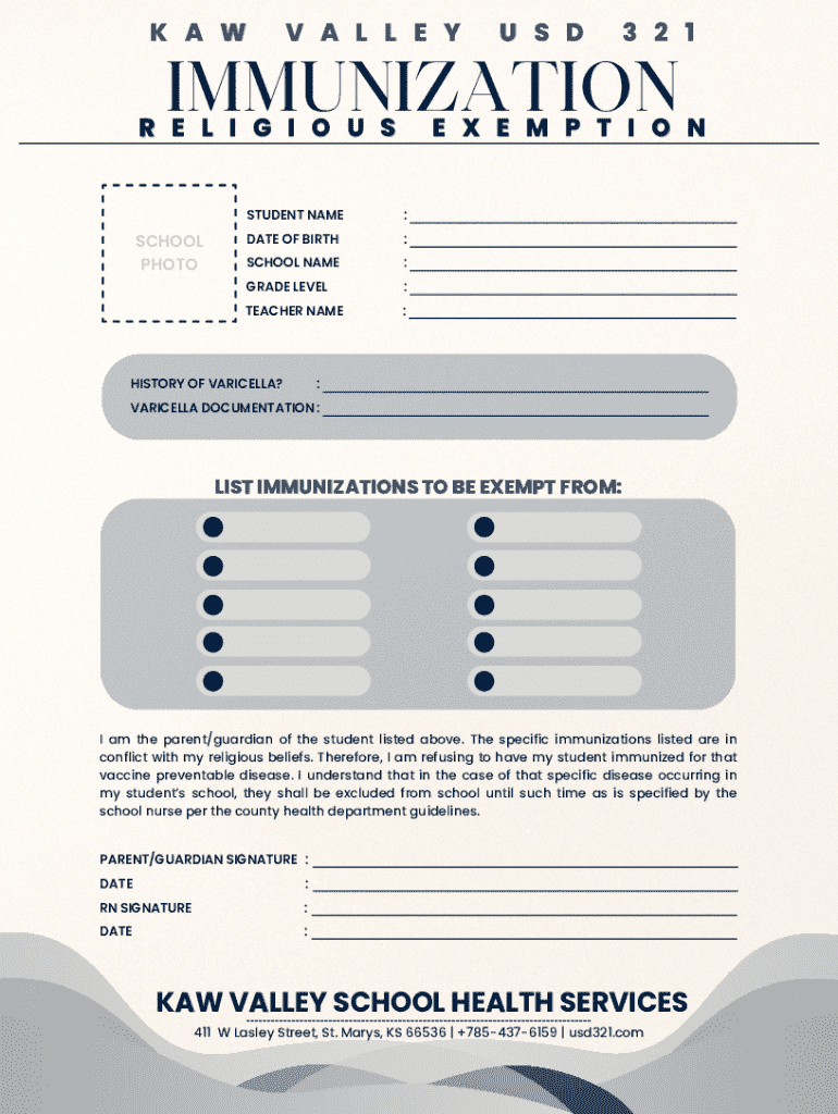 The form can be used by parents or guardians of school-aged children in Kansas who wish to exempt their children from immunization requirements based on religious beliefs.