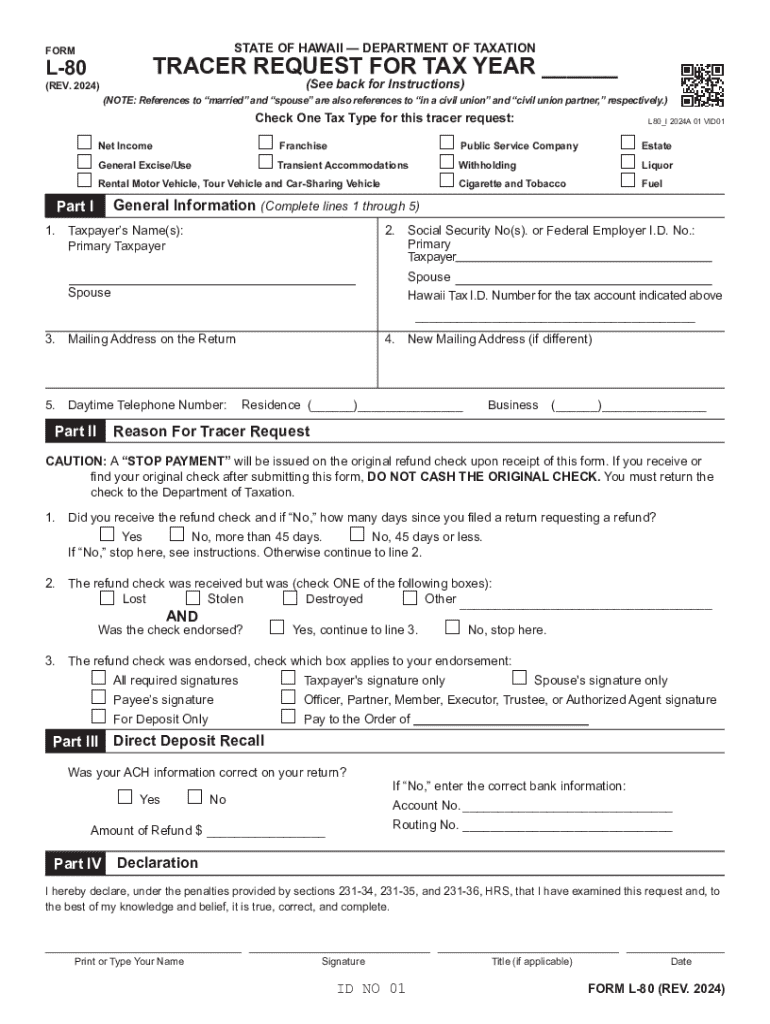 The Hawaii L-80 Tracer Request Form is a tax form used by taxpayers to trace a lost refund check or request a recall of a refund issued by direct deposit.