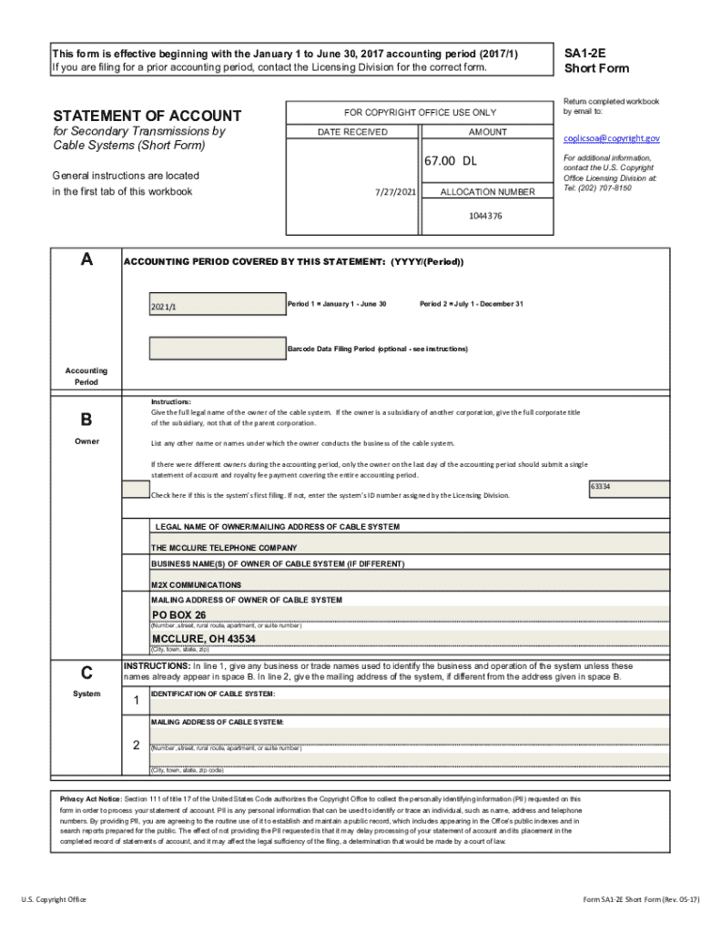 The US Copyright Office Form SA1-2E is a government document used by cable system owners to report secondary transmissions to the U.S. Copyright Office.