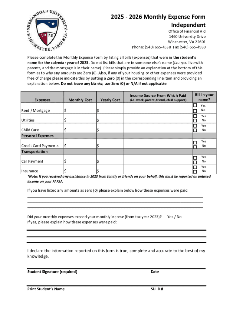 The 2025 - 2026 Monthly Expense Form is a student documentation tool used by learners in Virginia to list their monthly bills and expenses for financial assessment.