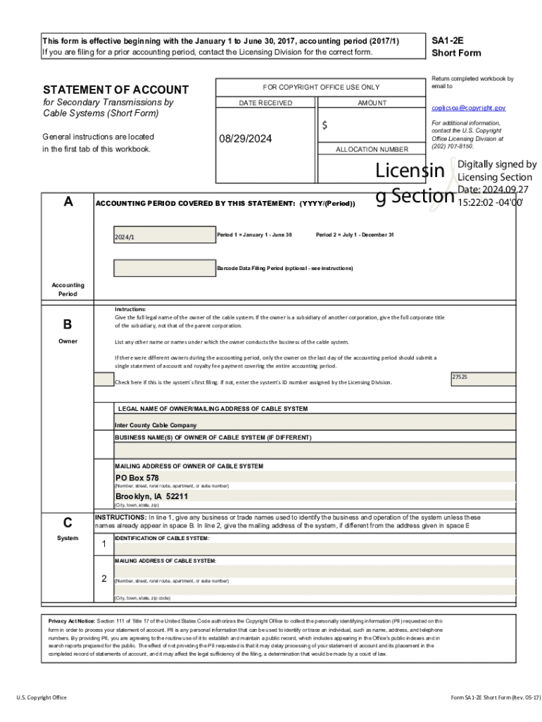 The US Copyright Office Form SA1-2E is a government form used by cable system owners to report secondary transmissions and relevant services to the U.S. Copyright Office.