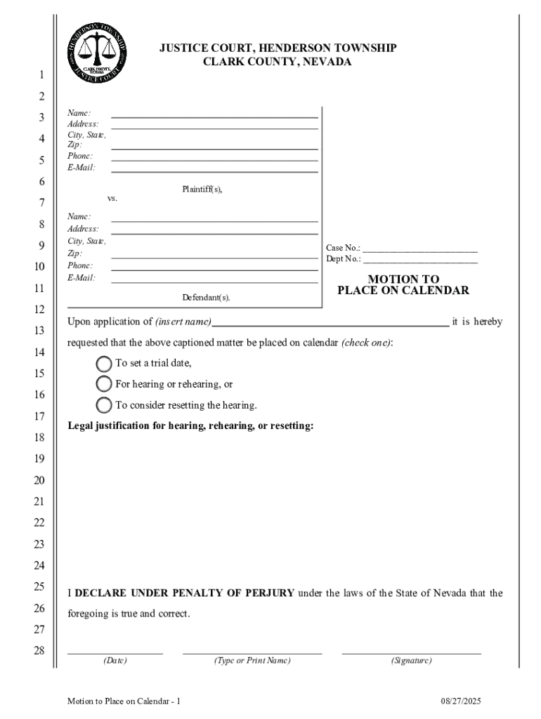 The Motion to Place on Calendar is a legal document used by plaintiffs or defendants to request a trial date or hearing in the Henderson Township Justice Court of Clark County, Nevada.