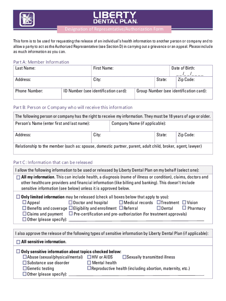 The Designation of Representative Authorization Form allows a party to act as an Authorized Representative for healthcare actions such as grievances and appeals. This form functions as a healthcare authorization form, enabling the release of an individual’s health information to another party. It is essential that the member or their legal representative sign the form to ensure its validity.