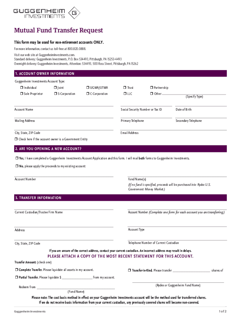 The Mutual Fund Transfer Request Form is a financial document used by account owners to transfer assets from one custodian to Guggenheim Investments.
